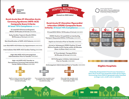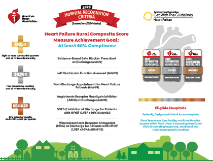 All hospitals participating in Get With The Guidelines - Stroke, Heart Failure or Coronary Artery Disease are eligible for recognition under the rural award program. These unique sets of performance metrics are specifically tailored to accomplishments in the rural setting. Learn more about specific programs for rural hospitals.