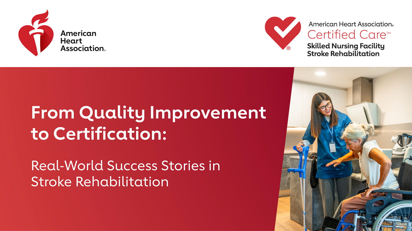This recorded discussion features two skilled nursing facilities and a critical access hospital with swing beds that have earned American Heart Association Skilled Nursing Facility Stroke Rehabilitation Certification. They share best practices and innovations that strengthen their stroke care programs, and presenters discuss how certification drives meaningful improvements—from developing tailored patient education materials to building strong, collaborative partnerships with hospital teams that support seamless transitions of care.