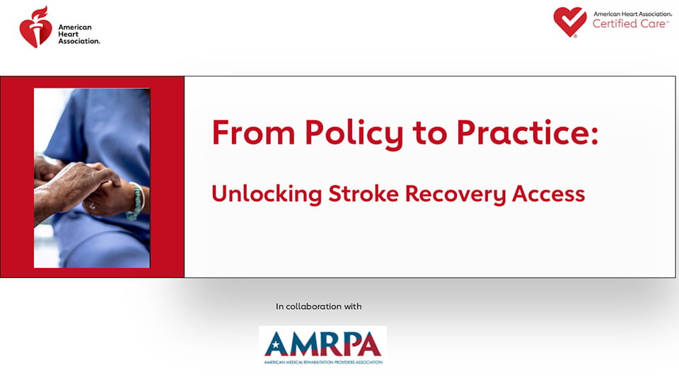 This recorded panel discussion with the American Heart Association and the American Medical Rehabilitation Providers Association (AMRPA) explores the urgent need for high-quality post-stroke rehabilitation, the barriers patients and caregivers face, and actionable policy solutions to close gaps in care. Learn how performance measures, advocacy, and innovative models can transform recovery outcomes and reduce disparities across communities.